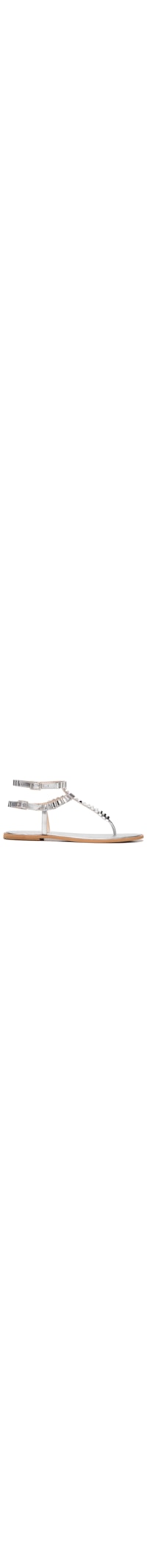 A sandália prata é produzida em couro com superfície metalizada. A peça de modelo rasteira possui bico arredondado, tiras médias com tachas, salto flat, solado laqueado e fechamento lateral por fivelas metálicas reguláveis.