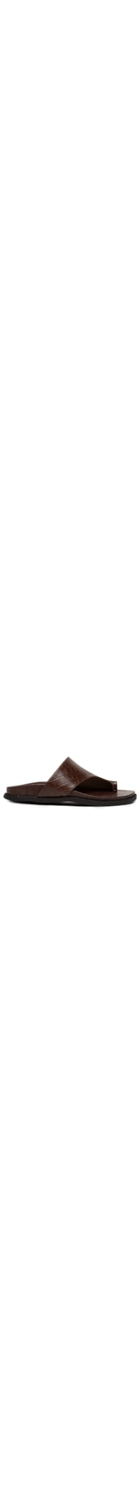 A sandália marrom é produzida por couro com superfície texturizada. A peça de modelo rasteira possui bico arredondado, tira larga com assimetria, nome da marca em baixo-relevo na palmilha e solado emborrachado.
