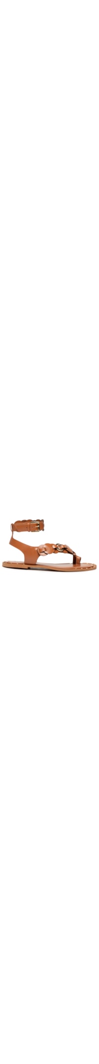 A sandália marrom é produzida em couro. A peça de modelo rasteira possui bico arredondado, tiras médias com detalhe transpassado e aplicação de aviamentos metalizados aplicados na parte superior, salto flat, solado laqueado e fechamento lateral por fivela metálica regulável.