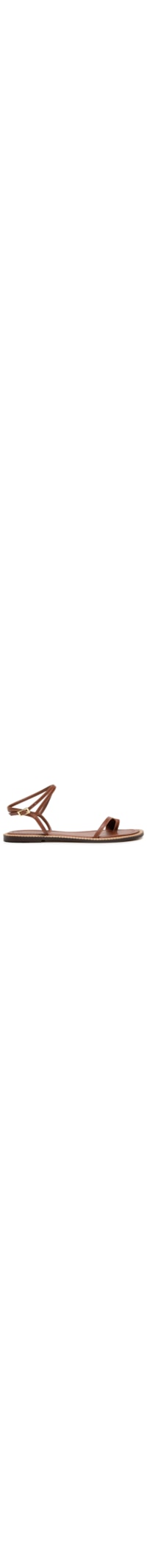 A sandália marrom é produzida em couro com superfície lisa. A peça possui bico arredondado, tira frontal fina aplicada sobre os dedos e tira central que se conecta às tiras posteriores, tiras finas que contornam o tornozelo, palmilha acolchoada com nome da marca aplicado, entressola com acabamento pespontado e fechamento lateral por regulagem por fivela metálica.