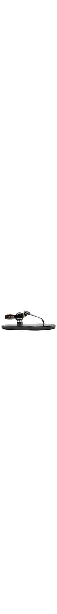 A sandália preta é produzida em couro. A peça possui bico arredondado, palmilha com nome da marca timbrado na cor dourado, tiras médias aplicadas na parte superior com aplicação de tachas metálicas e aviamento metalizado aplicados na parte superior, solado laqueado e fechamento lateral por fivela metálica regulável.
