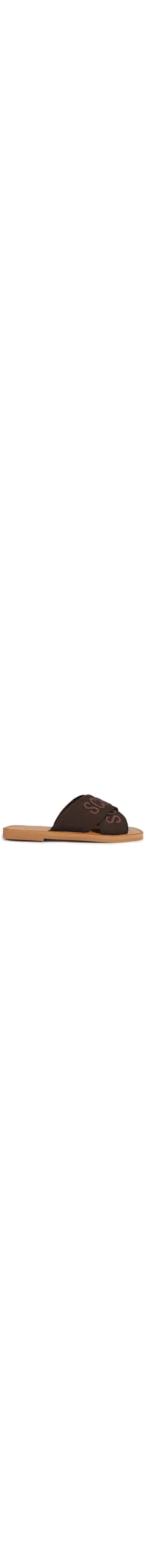 A sandália marrom é produzida por material têxtil. A peça de modelo rasteira possui bico quadrado, tiras largas em gorgurão cruzadas e sobrepostas com nome da marca bordado, palmilha com nome da marca timbrado, salto flat e solado emborrachado.