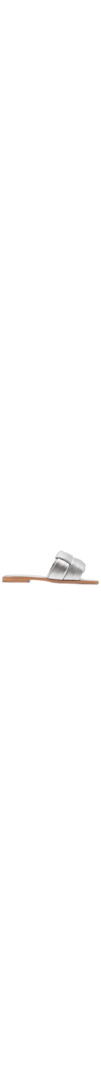 A sandália prata é produzida em couro com superfície metalizada. A peça de modelo rasteira possui bico quadrado, tiras superiores acolchoadas sobrepostas, palmilha macia com nome da marca timbrado, salto flat e solado laqueado.