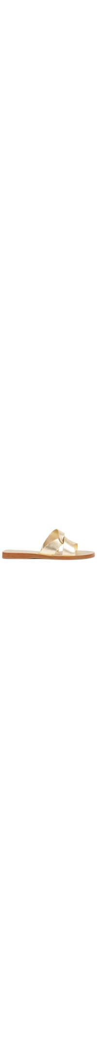 A sandália dourada é produzida em material sintético com superfície metalizada. A peça de modelo rasteira possui bico arredondado, tiras largas transpassadas e solado laqueado.