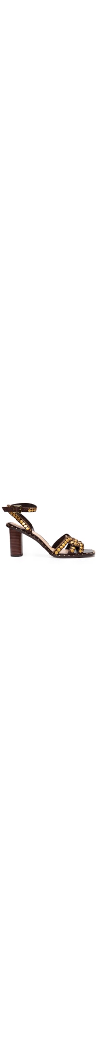 A sandália marrom é produzida em couro. A peça possui bico quadrado, tiras entrelaçadas adornadas por rebites metálicos, salto alto de modelo bloco com acabamento fachetado, fechamento por fivela com ajuste no tornozelo, solado laqueado, nome da marca gravado na palmilha em tom contrastante.
