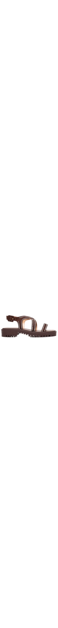 A sandália marrom é produzida em couro. A peça possui bico quadrado, tiras médias com strass aplicados, palmilha com nome da marca timbrado em cor contrastante, acabamento pespontado em cor contrastante, fechamento posterior por fivela, e salto tratorado.
