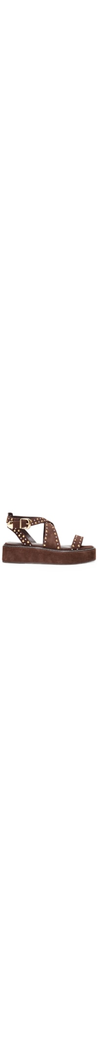 A sandália marrom é produzida em camurça. A peça possui bico quadrado, tiras largas com tachas metálicas e cruzadas na parte superior, salto médio de modelo plataforma, palmilha macia, solado emborrachado e fechamento lateral por fivela metálica regulável.