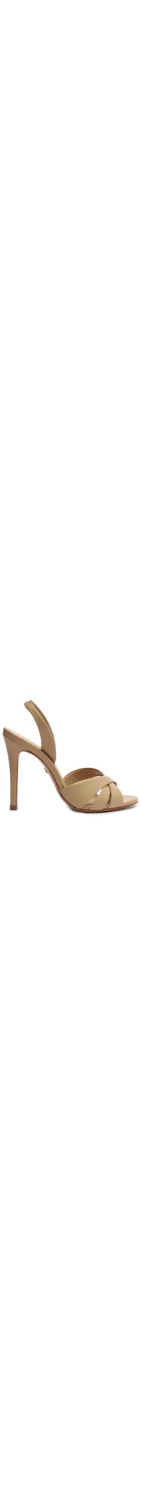 A sandália bege é produzida em couro. A peça solta ao corpo, possui bico arredondado, tiras finas frontais cruzadas, tira fina posterior com recorte elástico, nome da marca em baixo-relevo e salto fino alto.