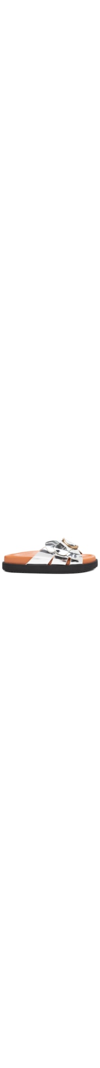 A sandália prateada é produzida em material sintético com superfície metalizada. A peça possui bico arredondado, tiras largas superiores com sobreposição de tiras pespontadas, maxi fivela metálica decorativa aplicada na parte frontal, palmilha anatômica macia com nome da marca timbrado, salto flatform e solado em EVA com superfície tratorada.