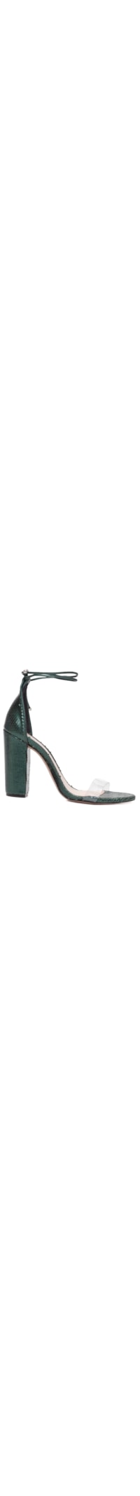 A sandália verde é produzida em material sintético com superfície em paetê. A peça possui bico arredondado, tira superior média com transparência, palmilha macia na cor bege, salto alto, tiras finas alongadas na para superior e fechamento por amarração.
