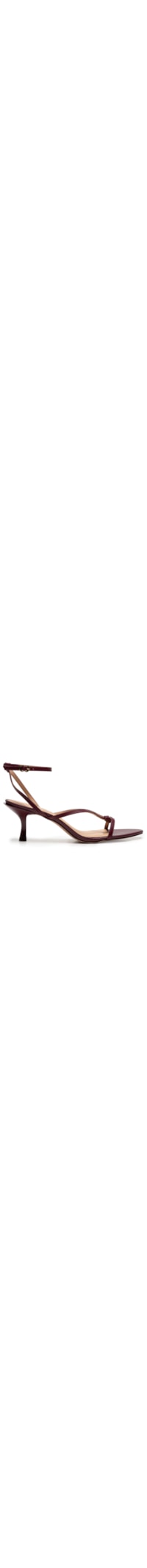 A sandália vinho é produzida em couro. A peça possui bico fino, tiras frontais finas com detalhe de enlace palmilha com nome da marca timbrado em cor contrastante, salto médio e fechamento posterior por fivela.