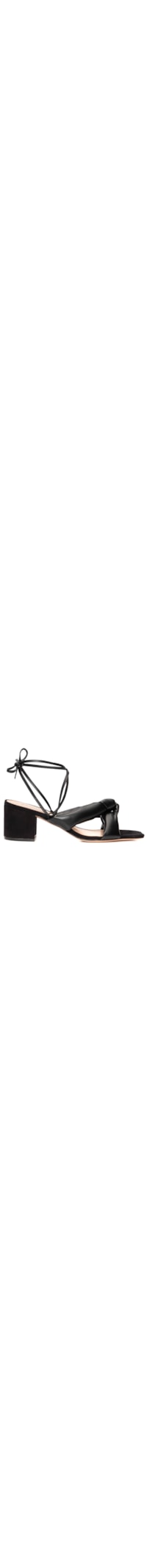 A sandália preta é produzida em couro. A peça possui bico quadrado, tiras médias acolchoadas com detalhe de nó, tiras finas estendidas para amarração, palmilha macia com nome da marca timbrado, salto médio de modelo bloco, solado laqueado e fechamento posterior por amarração.