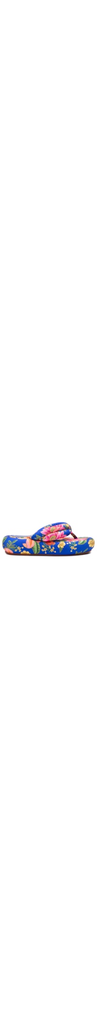 A sandália azul é produzida por material têxtil. A peça possui bico arredondado, salto flat, tiras duplas acolchoadas aplicadas na superfície, estampa floral em cores contrastantes, nome da marca aplicada na palmilha e solado emborrachado.