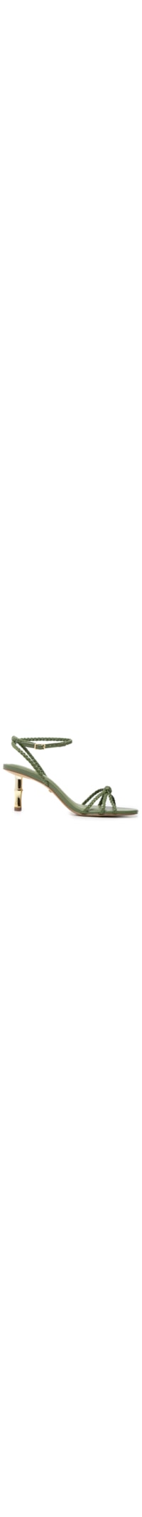 A sandália verde é produzida em material sintético. A peça possui bico arredondado, tiras finas trançadas com detalhe de nó na parte frontal, palmilha macia, salto médio metálico com formato de bambu, solado laqueado e fechamento lateral por fivela metálica regulável.