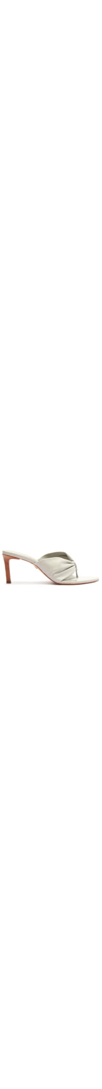 A sandália cinza é produzida em couro. A peça possui bico fino, tiras largas frontais com detalhe de prega frontal, palmilha macia com nome da marca em baixo-relevo, salto médio fino em madeira e solado laqueado.