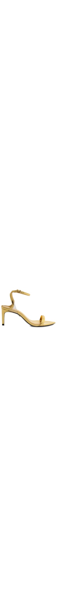 A sandália dourada é produzida em couro com superfície metalizada. A peça possui bico fino, tira fina frontal acolchoada, tira superior e posterior fina, detalhe em vinil com transparência nas laterais, palmilha macia com nome da marca em baixo-relevo, salto médio fino, solado laqueado e fechamento superior por fivela metálica regulável.