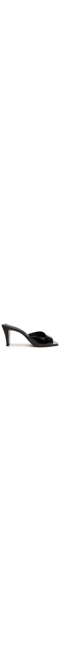 A sandália preta é produziada em laminado sintético. A peça possui bico quadrado assimétrico, tira superiores grossas assimétricas, palmilha macia com recorte acolchoado e nome da marca timbrado, salto médio de modelo lâmina e solado laqueado.