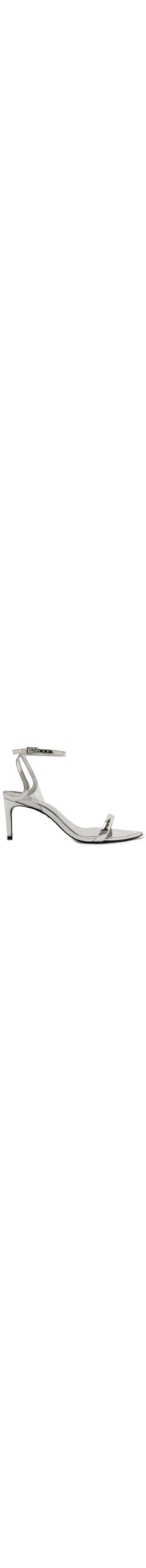 A sandália prata é produzida em material sintético com superfície metalizada. A peça possui bico fino, tira frontal média acolchoada, tira superior fina, palmilha macia com nome da marca em baixo-relevo, salto alto fino, solado laqueado e fechamento lateral por fivela regulável.