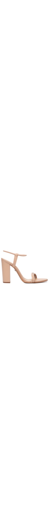 A sandália bege é produzida em couro. A peça possui bico arredondado, tira fina dupla frontal, tiras posteriores, salto alto grosso, solado laqueado, palmilha com o nome da marca, acabamento pespontado e sem fechamento.