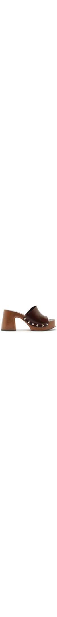 A sandália marrom é produzida em couro. A peça possui bico arredondado, tachas metálicas aplicadas nas laterais, palmilha com o nome da marca aplicado em tom metalizado, entressola amadeirada e salto alto meia pata.