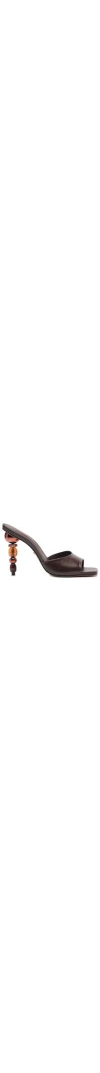 A sandália marrom é produzida em couro. A peça possui bico quadrado, tira larga, palmilha macia com nome da marca timbrado em cor contrastante, salto alto com detalhes metálicos e pedra em tom contrastante e solado laqueado.