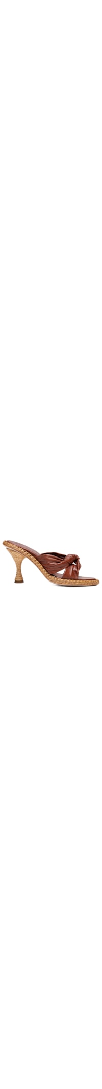 A sandália marrom é produzida em couro. A peça de modelo tamanco, possui bico arredondado, tira dupla larga na parte frontal com detalhe de nó, detalhe de corda trançada na lateral, palmilha macia com nome da marca timbrado, salto alto de modelo taça revestido com corda trançada e solado laqueado.