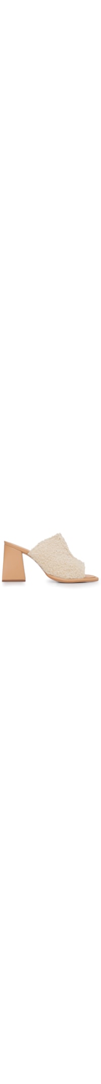 A sandália off white é produzida em material sintético com superfície em pelúcia. A peça de modelo mule possui bico arredondado, palmilha macia com o nome da marca aplicado em cor contrastante, salto médio modelo bloco e solado emborrachado.