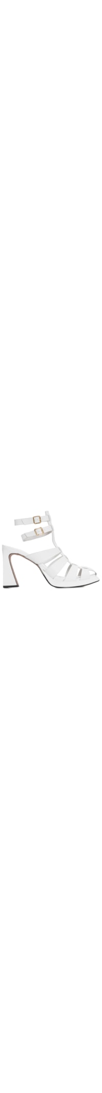 A sandália branca é produzida em couro. A peça possui bico quadrado, tiras médias, recortes superiores e laterais, palmilha macia com logo e nome da marca aplicados em relevo, salto alto, solado laqueado, acabamento pespontado e fechamento lateral por fivelas reguláveis.
