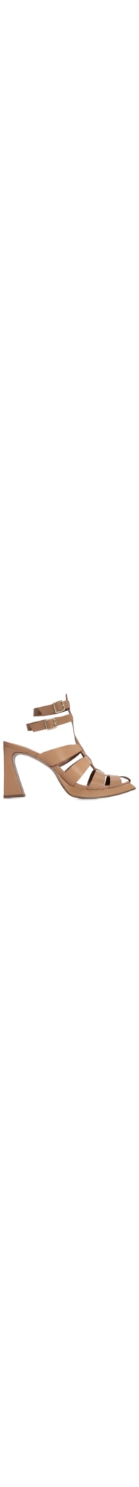 A sandália bege é produzida em couro. A peça possui bico quadrado, tiras médias, recortes superiores e laterais, palmilha macia com logo e nome da marca aplicados em relevo, salto alto, solado laqueado, acabamento pespontado e fechamento lateral por fivelas reguláveis.