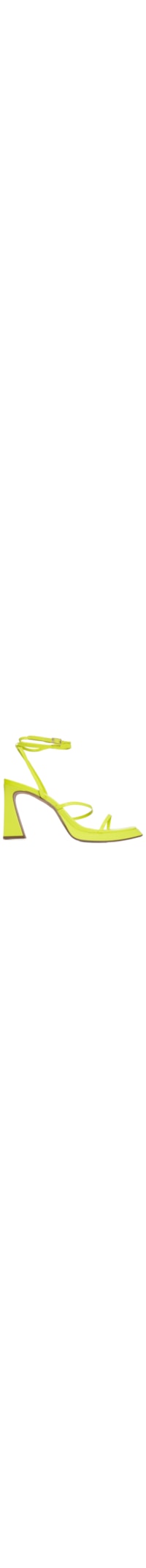 A sandália verde neon é produzida em material sintético. A peça possui bico quadrado, tiras frontais, salto alto assimétrico, palmilha macia com logo da marca em relevo, solado laqueado, acabamento pespontado e fechamento lateral por fivela.