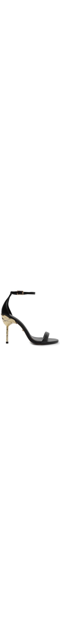 A sandália preta é produzida por couro. A peça possui bico redondo, salto fino metalizado em cor contrastante, tira média sobre os dedos, palmilha macia com nome da marca timbrado em tom metálico e fechemento lateral por fivela.