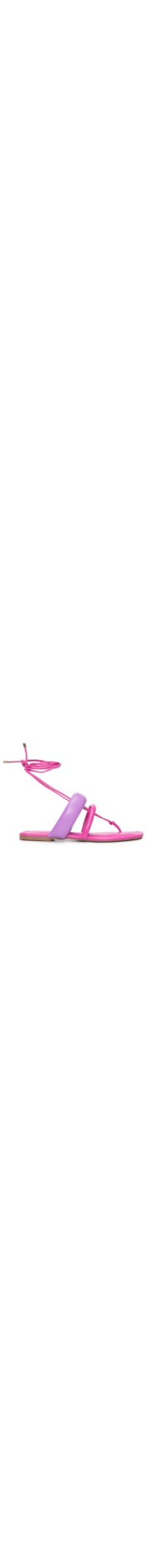 A sandália rosa é produzida em couro. A peça possui bico quadrado, tira frontais finas, tiras superiores acolchoadas, tira em cor contrastante, palmilha macia em couro com o nome da marca timbrado, forro em material sintético, salto flat, solado laqueado, acabamento pespontado e fechamento superior por amarração.
