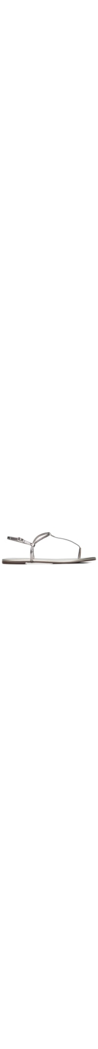 A sandália Prata é produzida em material sinético com superfície envernizada. A peça possui bico arredondado, tira fina aplicada, tira posterior, palmilha macia, salto flat, acabamento pespontado, solado antiderrapante e fechamento por fivela ajustável.