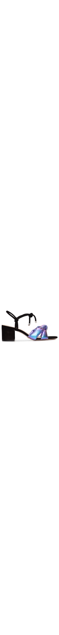 A sandália preta é produzida em nobuck. A peça possui bico quadrado, tira frontal em cor contrastante com detalhe de nó e superfície holográfica, salto médio modelo bloco, palmilha macia, solado laqueado, acabamento pespontado e fechamento frontal por amarração.