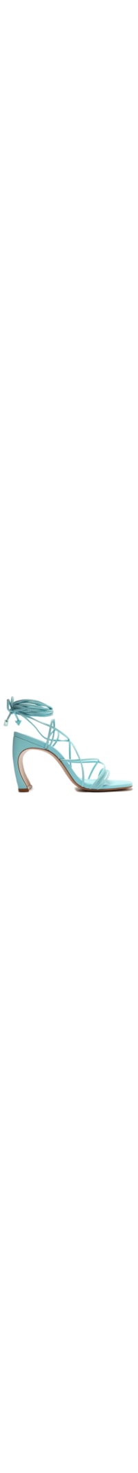 A sandália azul é produzida em material sintético. A peça de modelo lace up possui bico quadrado, tiras frontais, palmilha macia com nome da marca aplicado, tiras finas na parte posterior, tiras cruzadas na parte frontal, salto de modelo curvado, solado laqueado, acabamento pespontado e fechamento posterior por tira de amarração.