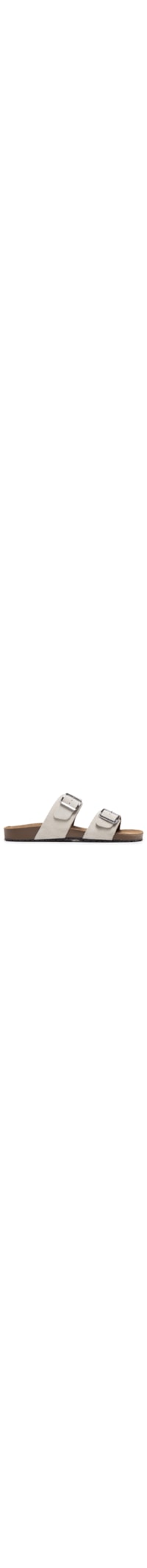 A sandália branca é produzida em couro. A peça possui bico arredondado, tiras largas superiores, fivelas metalizadas aplicadas, palmilha anatômica com nome da marca aplicado e solado emborrachado levemente tratorado na cor preta.