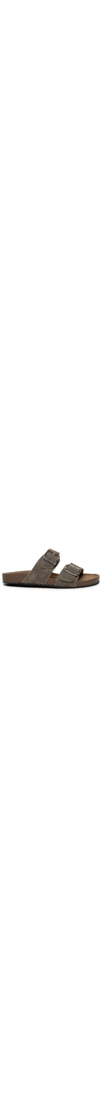 A sandália cinza é produzida em couro. A peça possui bico arredondado, tiras largas com perfuros e regulagem por fivela metálica quadrada, entressola marrom e solado emborrachado tratorado.