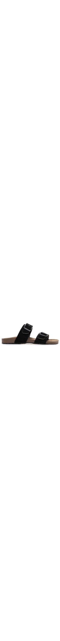 A sandália preta é produzida em couro. A peça possui bico arredondado, tiras largas com perfuros e reguláveis por fivela metálica, entressola marrom e solado emborrachado.