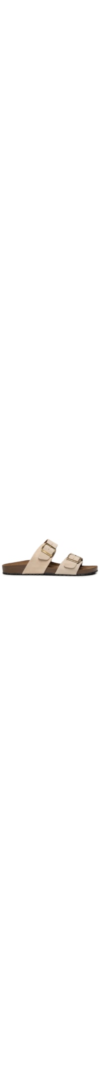 A sandália Bege é produzida em Camurça . A peça possui bico arredondado, duas tiras largas sobre o pé com acabamento texturizado, fivelas metálicas laterais com regulagem, palmilha anatômica em material sintético com superfície acamurçada e logo da marca aplicado, entressola em cortiça e solado emborrachado com frisos para maior aderência.