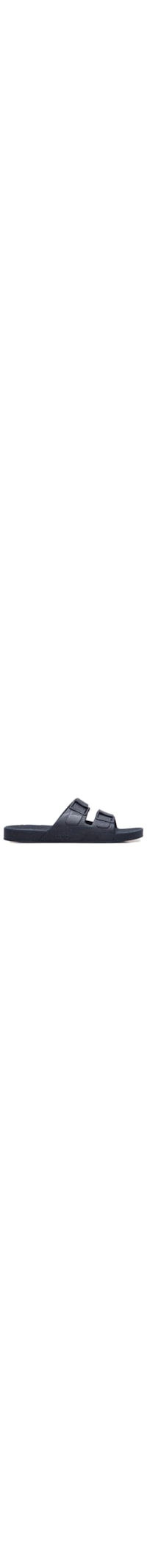 A sandália azul marinho é produzida em PVC ecológico expandido. A peça possui bico arredondado, tiras médias com detalhe figurativo de fivela em relevo, palmilha texturizada e detalhe do nome da marca em relevo na parte lateral.