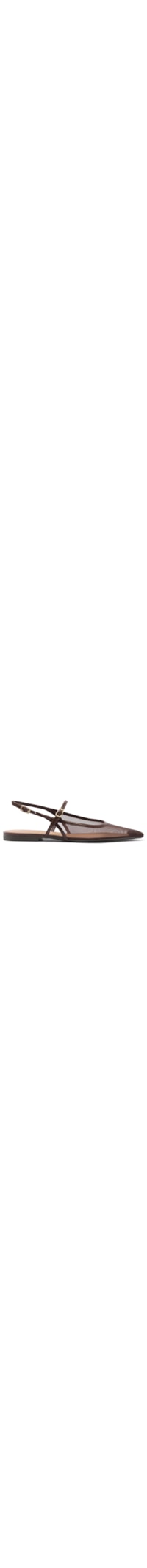 A sapatilha marrom é produzida em material sintético com superfície em tela. A peça possui bico fino, recorte em transparência, tiras finas com fivelas metálicas ajustáveis, palmilha macia, salto baixo, solado emborrachado e fechamento lateral por fivela.