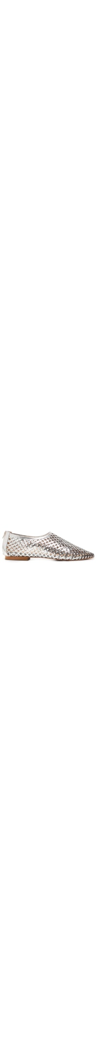 A sapatilha prateada é produzida em couro com superfície metalizada. A peça possui bico arredondado, recortes vazados em lazer, recorte posterior, palmilha com nome da marca, salto flat, solado laqueado e fechamento posterior por zíper.