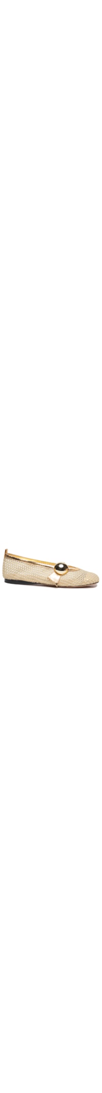 A sapatilha dourada é produzida em tela. A peça possui bico arredondado, tira fina superior com lateral assimétrica e maxi aplicação de meia esfera metálica, recorte posterior com puxador em couro, leve transparência, palmilha macia com nome da marca timbrado, salto flat e solado laqueado.