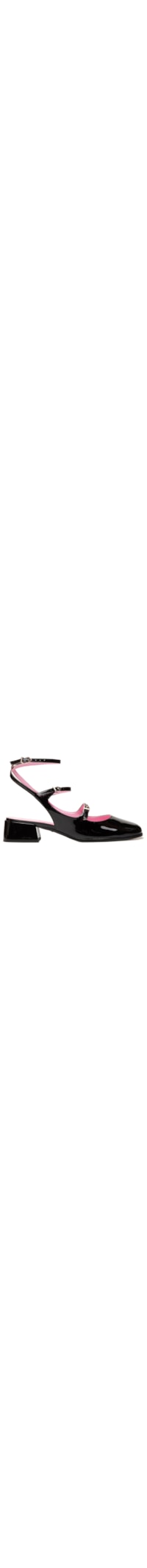 o sapatilha Preta é Produzida Em couro. A Peça Possui Bico Arredondado, Tiras Finas Frontais E Posterior Com Fivelas Metálicas Aplicadas, Palmilha Macia Rosa Com Nome Da Marca Em Baixo-relevo, Salto Baixo Bloco, Acabamento Envernizado, Forro Rosa E Fechamento Lateral Por Fivela Metálica Com Regulagem.