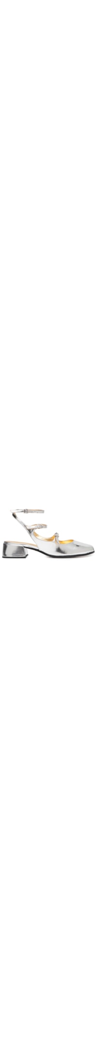 O sapato prata é produzido por couro. A peça possui bico quadrado, tiras finas sobre a superfície, palmilha macia na cor dourada com nome da marca timbrado, salto bloco baixo, solado liso e fechamento por fivela.