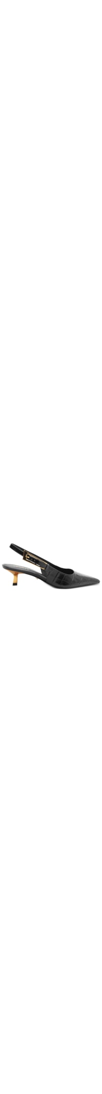 O sapato preto é produzido em couro com superfície texturizada. A peça de modelo scarpin possui bico fino, palmilha macia com nome da marca timbrado, tira lateral que se estende a parte posterior fina, salto médio metalizado e estilizado, solado laqueado e fechamento lateral por fivela regulável.