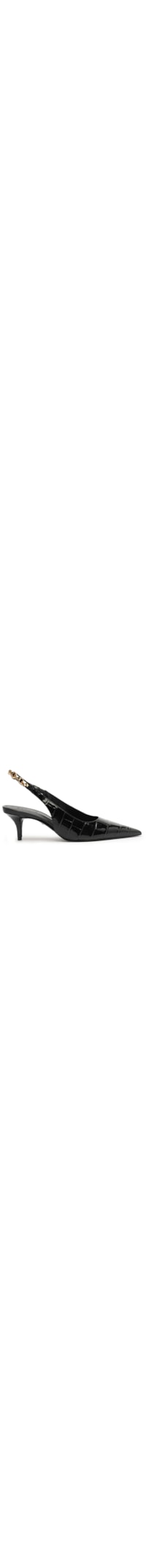 O scarpin preto é produzido em couro com superfície texturizada. A peça de modelo slingback* possui bico fino, tira lateral que se estende a parte posterior fina com detalhe de elástico aplicado na parte lateral e corrente metálica aplicada na parte posterior, palmilha macia com nome da marca em baixo-relevo, salto baixo fino e solado laqueado.