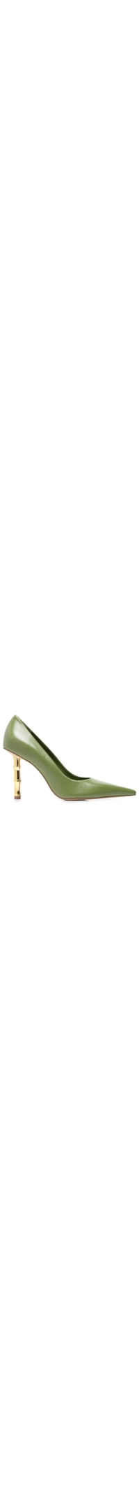 O scarpin verde é produzido em couro. A peça possui bico fino, palmilha macia, salto alto médio metálico com formato de bambu e solado laqueado.