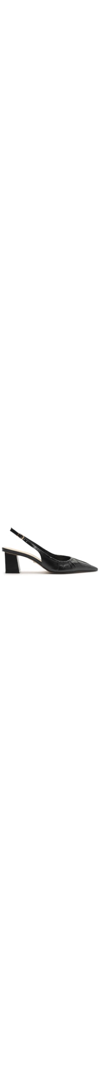 O scarpin preto é produzido em couro. A peça de modelo slingback* possui bico fino, parte frontal com detalhe de pregas, palmilha com o nome da marca em tom metalizado, salto médio de modelo bloco, solado laqueado e fechamento posterior por fivela metálica.