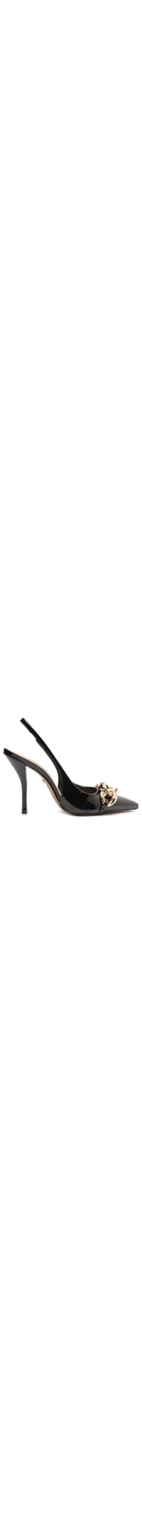 O scarpin preto é produzido em material sintético com superfície envernizada. A peça possui bico fino, aplicação superior de maxi elos metálicos, tira fina com recorte elástico na parte posterior, palmilha com o nome da marca timbrado, salto alto fino e solado laqueado.